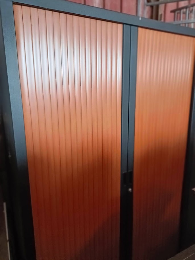 La tablette fixée en partie haute des armoires, indépendante du dessus, permet de recevoir une charge élevée de dossiers sans déformation et garantit une parfaite rigidité et donc un fonctionnement optimal des rideaux.