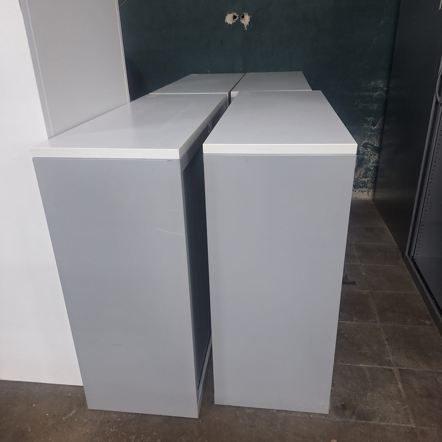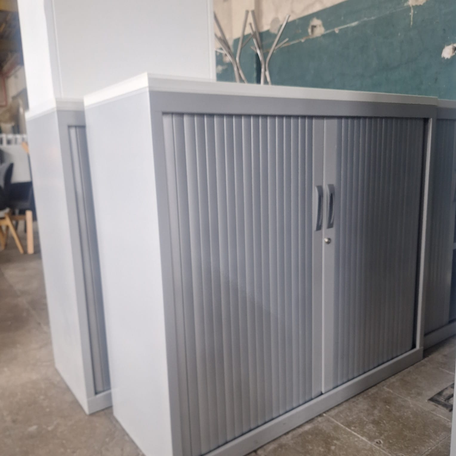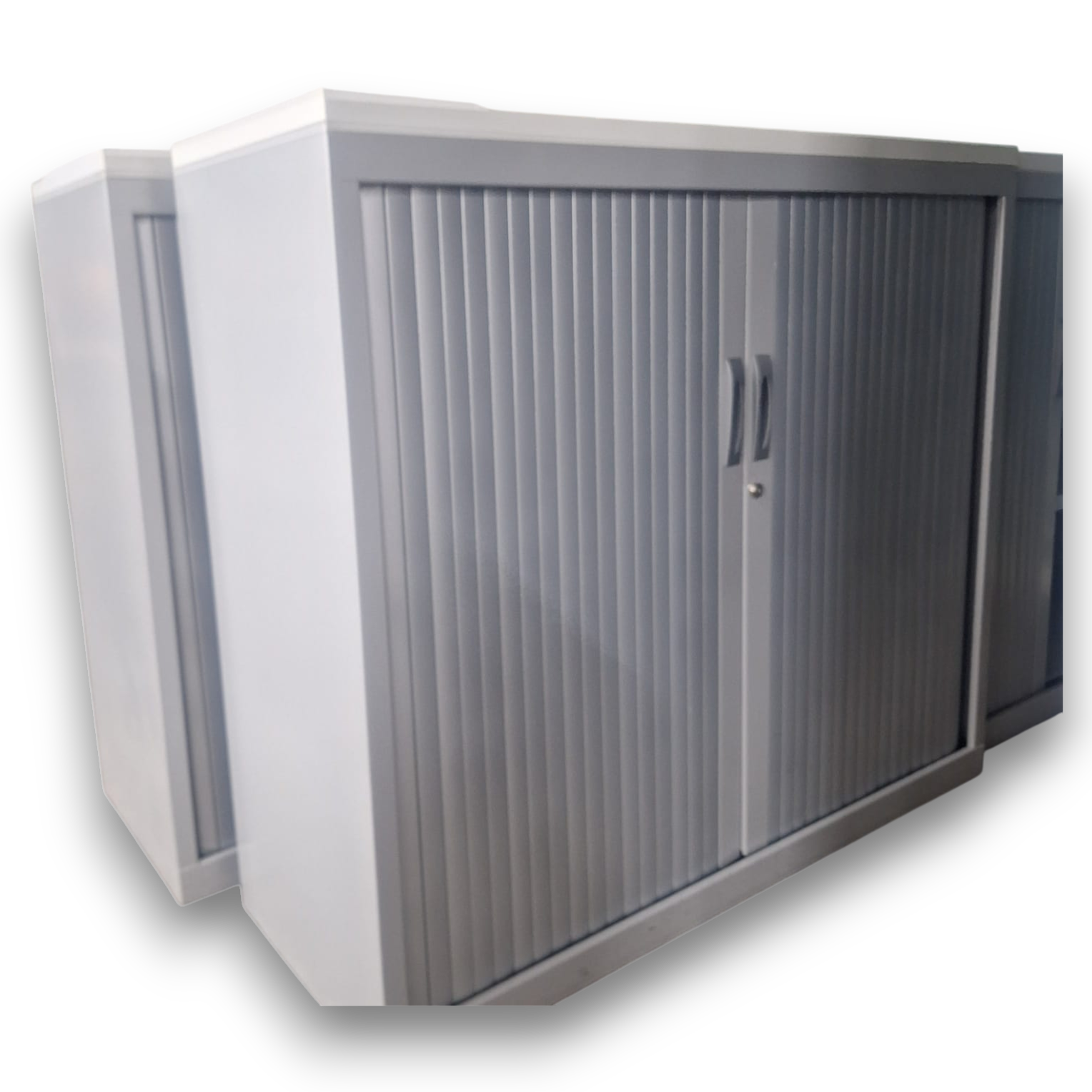 Les portes à rideaux coulissent latéralement, ce qui permet d’ouvrir le meuble sans empiéter sur le passage, même dans les couloirs ou petits bureaux. L’intérieur est équipé d’étagères métalliques réglables en hauteur (selon configuration), pour adapter le rangement aux classeurs, boîtes d’archives ou consommables. Une serrure en façade permet de sécuriser le contenu.