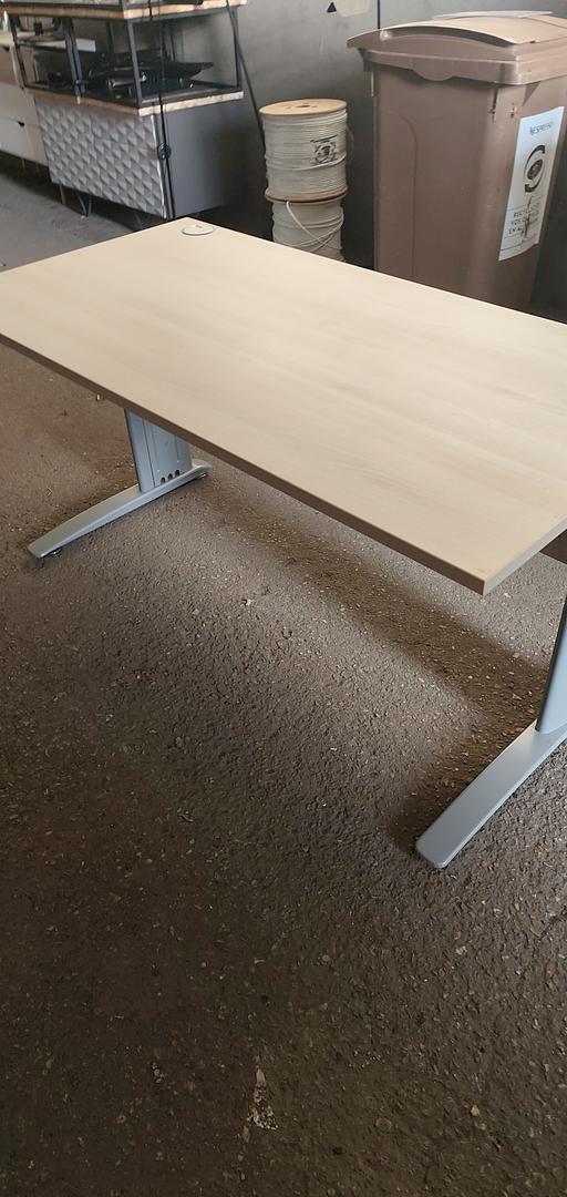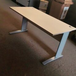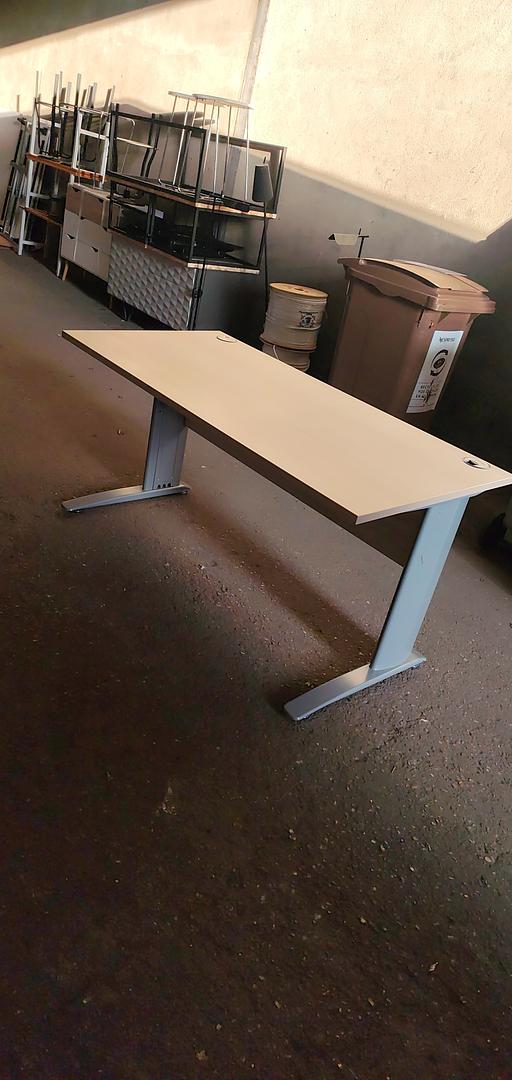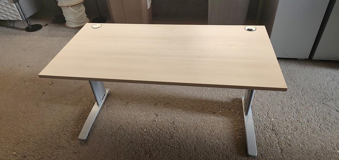 Bureau droit professionnel 150 x 75 cm, plateau finition bois clair, piètement métal gris, 2 passe-câbles. Sobre, robuste et pratique pour bureau ou télétravail.