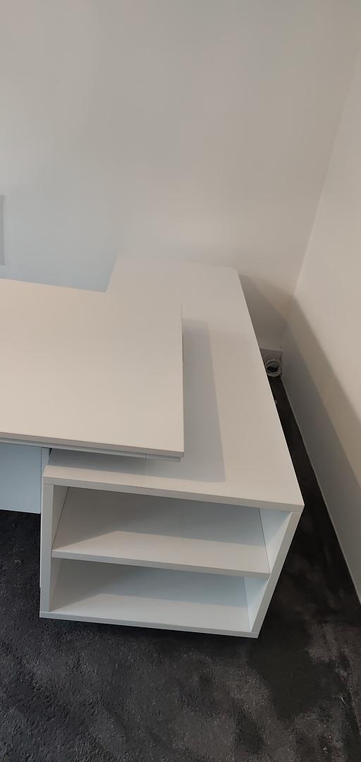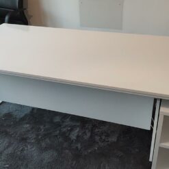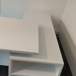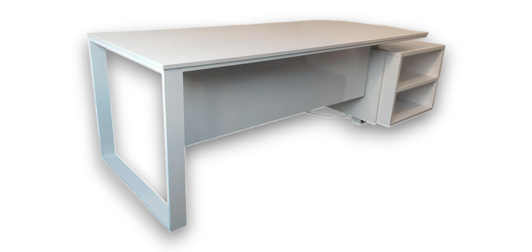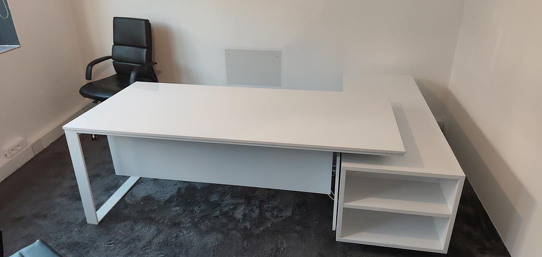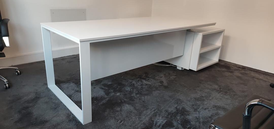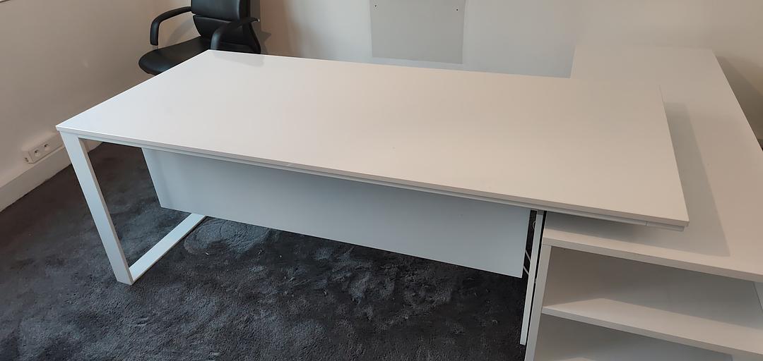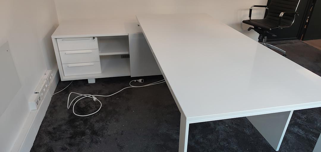 Bureau de direction blanc laqué : plateau 200 x 90 cm, retour 180 cm avec porte coulissante, caisson 3 tiroirs et voile de fond. Look premium.