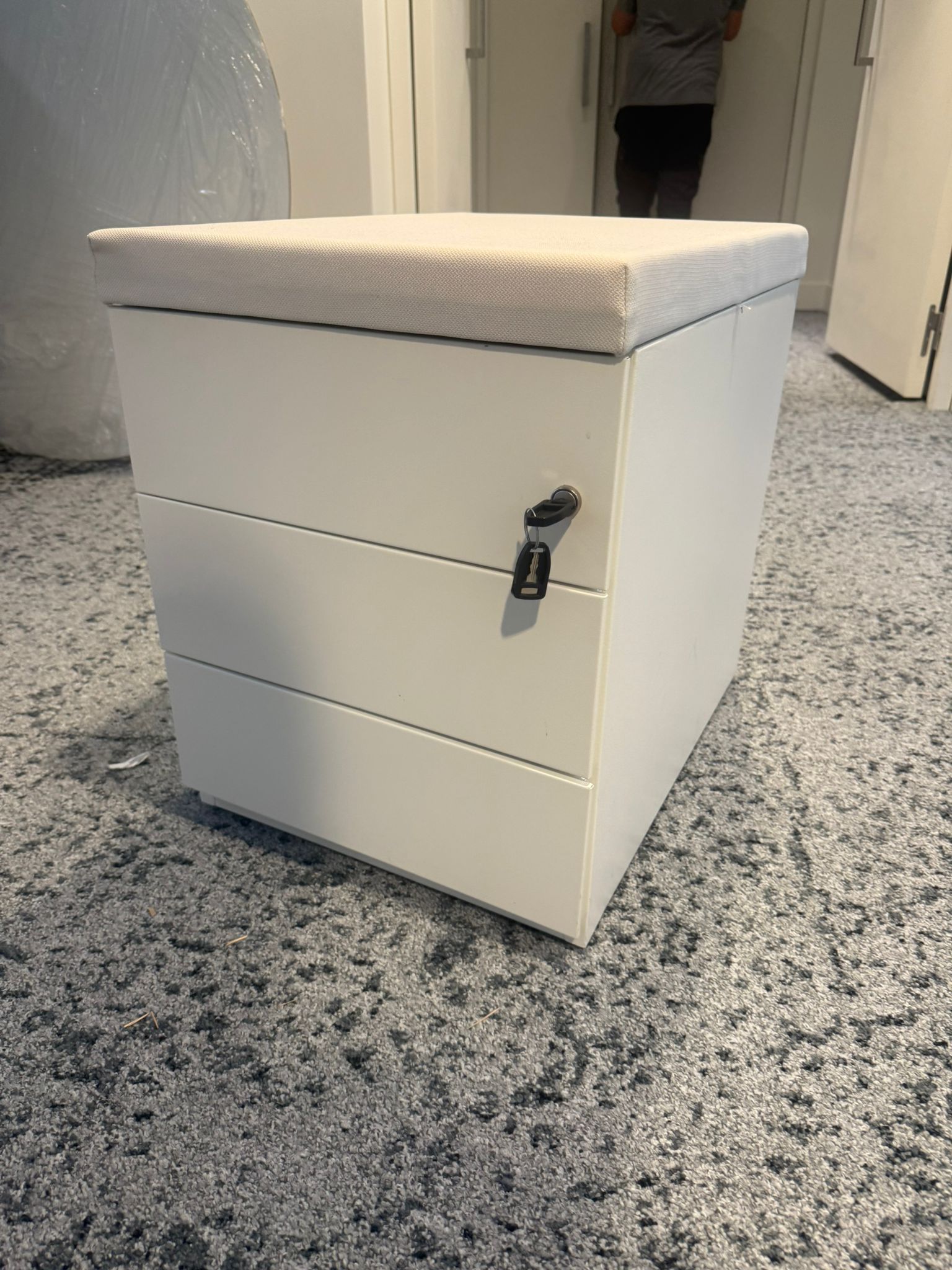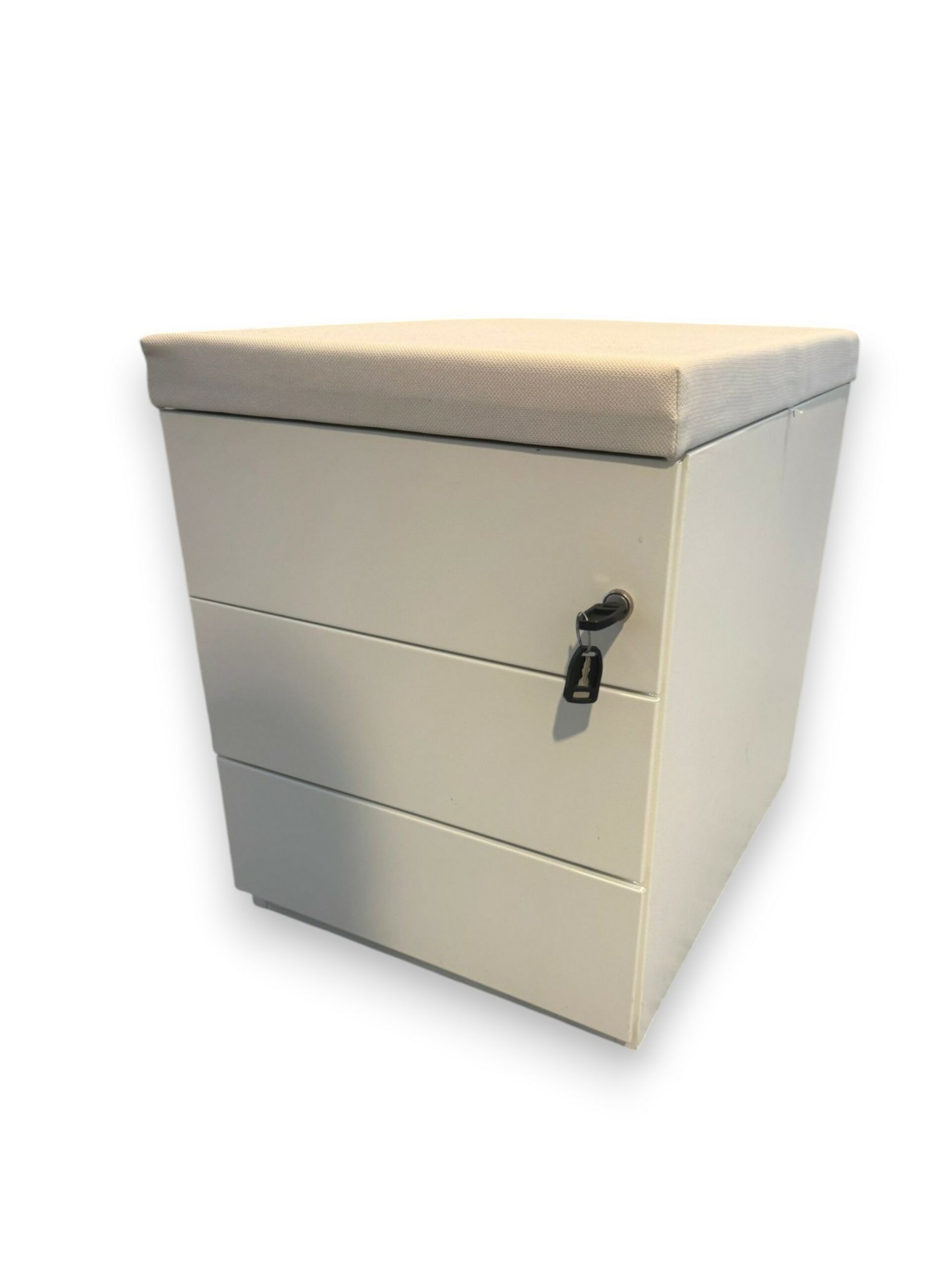 Le caisson avec coussin d’assise est une solution ingénieuse et polyvalente pour les espaces de travail modernes. À la fois meuble de rangement et siège d’appoint, il optimise l’utilisation de l’espace tout en apportant confort et praticité. Son coussin en tissu beige/blanc cassé offre une assise agréable, idéale pour les échanges informels au bureau. Conçu en métal robuste, il garantit solidité et longévité, tandis que ses roulettes, dont une anti-basculement, facilitent la mobilité et la sécurité au quotidien.