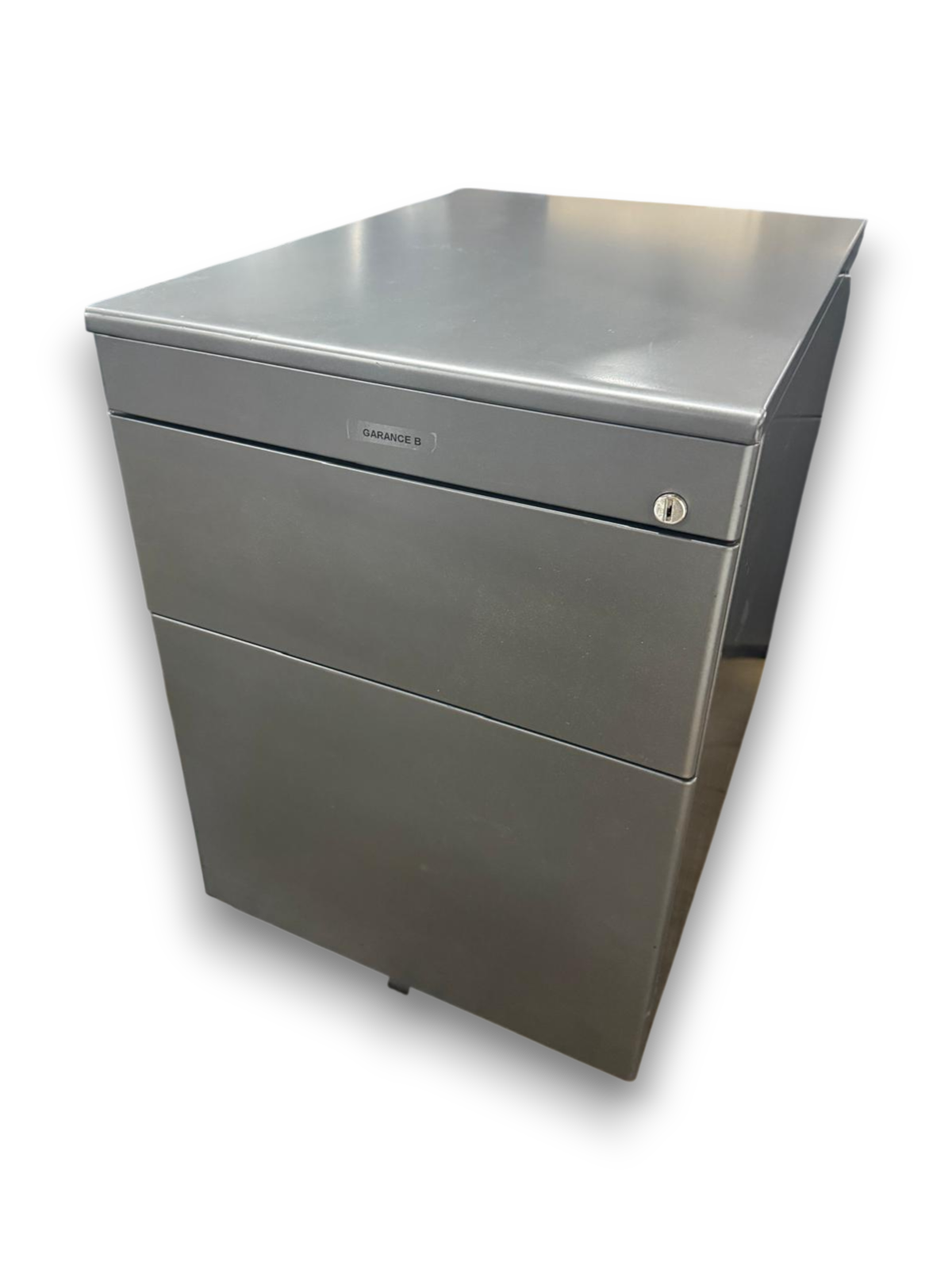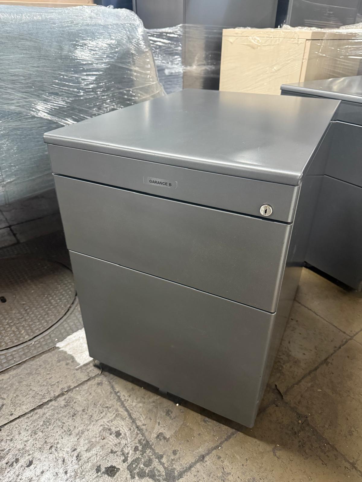 Caisson de bureau professionnel métal gris, 3 tiroirs dont 1 grand dossier suspendu, avec serrure. Compact et robuste : L58 × P43 × H56 cm.