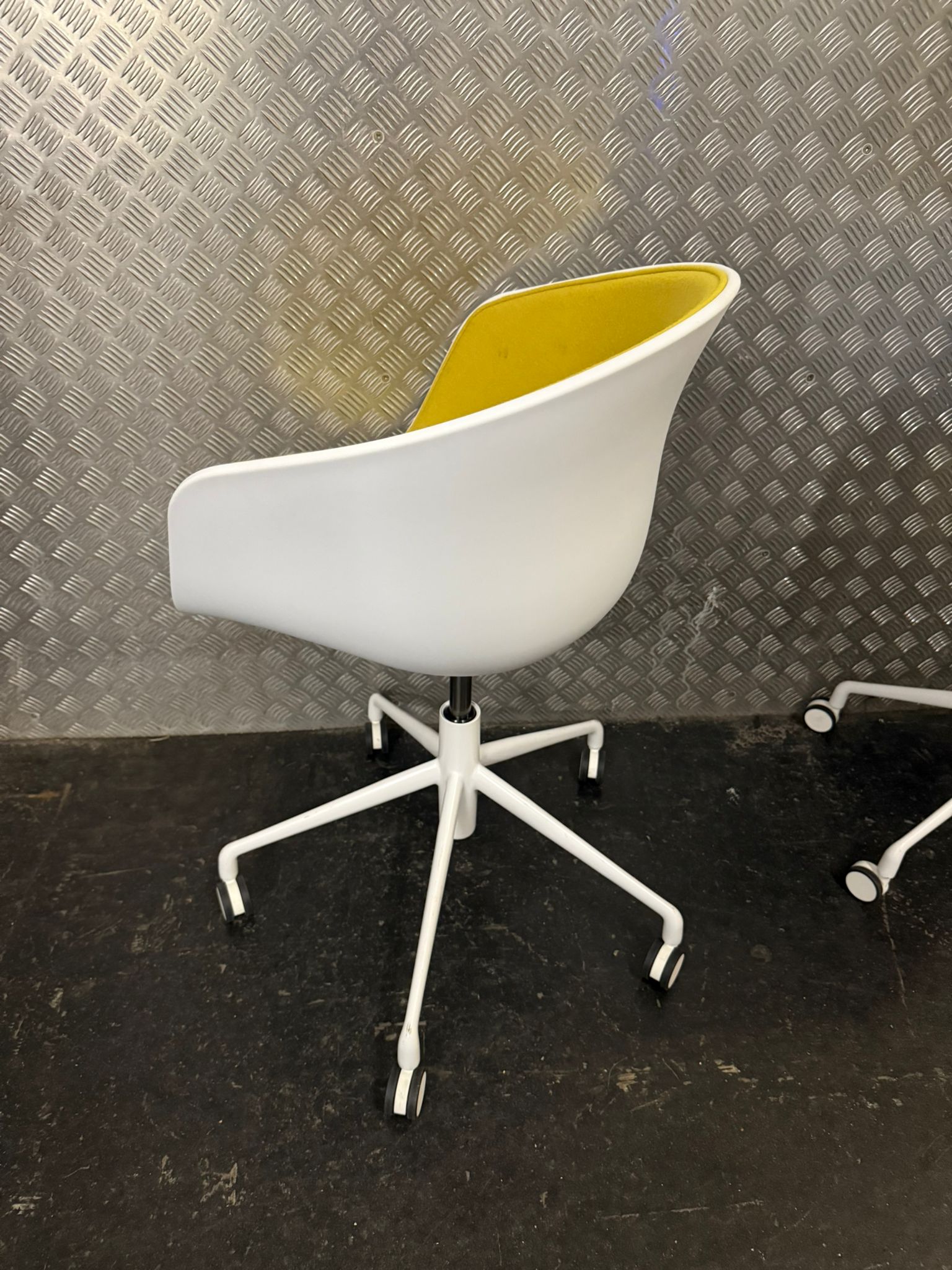 La coque en polypropylène blanc apporte une finition moderne et facile d’entretien, tandis que l’assise et l’intérieur sont habillés d’un revêtement en tissu disponible en 10 couleurs pour s’adapter à tous les styles : bureau contemporain, salle de réunion, open space ou espace d’accueil.