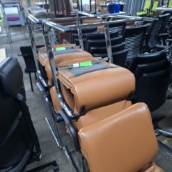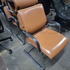 Avec son revêtement en simili cuir marron et son piètement luge en métal chromé, il apporte une touche moderne et raffinée à vos bureaux, salles d’attente ou salles de réunion.