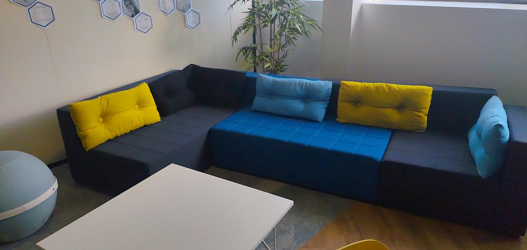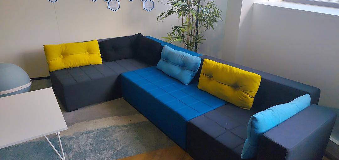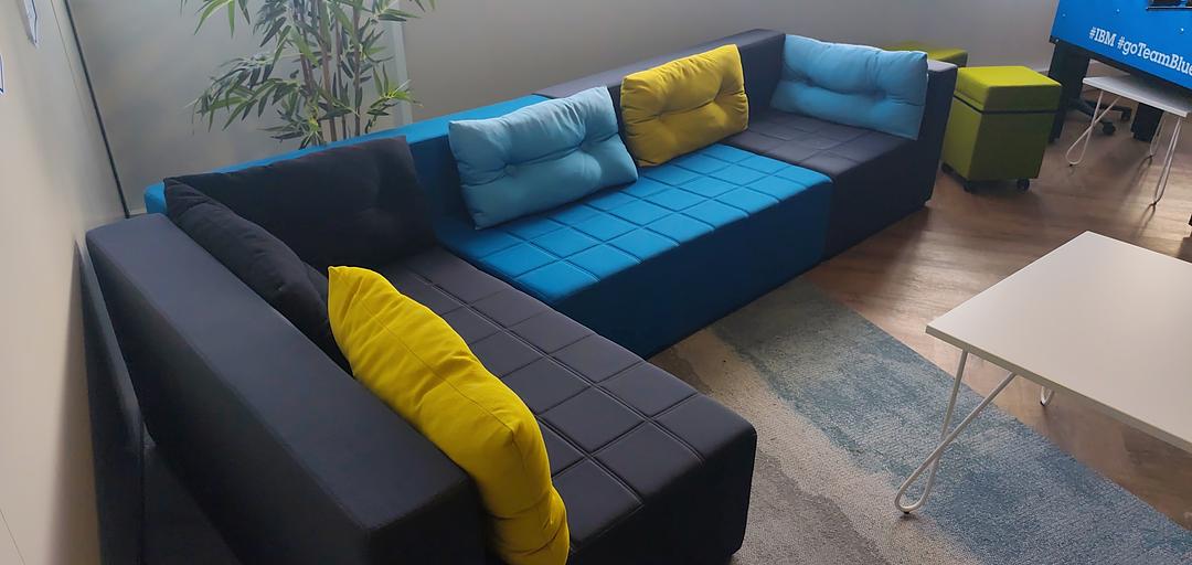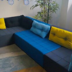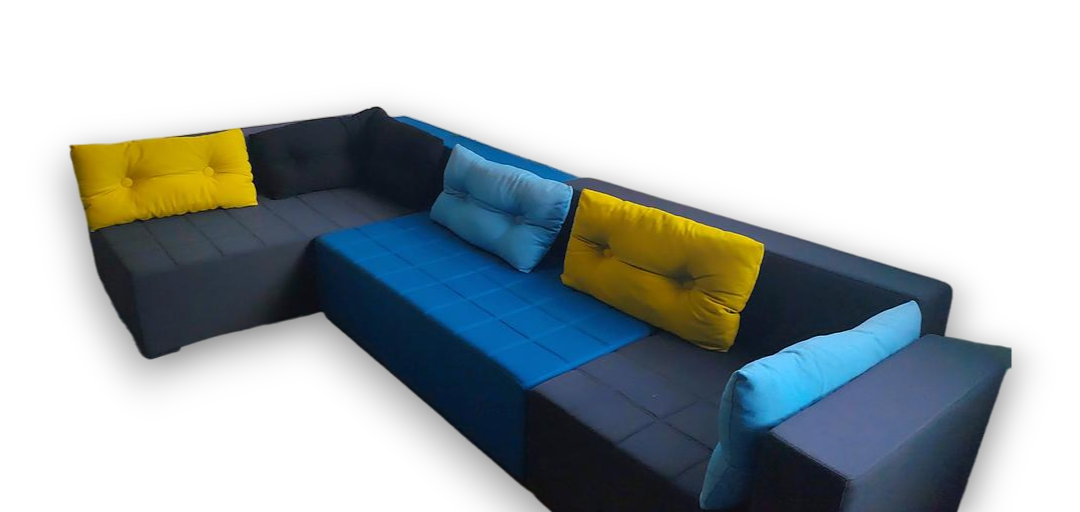 Ce salon en L modulable, composé de trois éléments indépendants, est parfait pour créer un espace détente moderne et chaleureux. Avec ses couleurs contrastées — bleu, noir et coussins décoratifs jaunes et turquoise — il apporte un style dynamique et contemporain, idéal pour les bureaux, open spaces, salles de pause ou même un intérieur design.