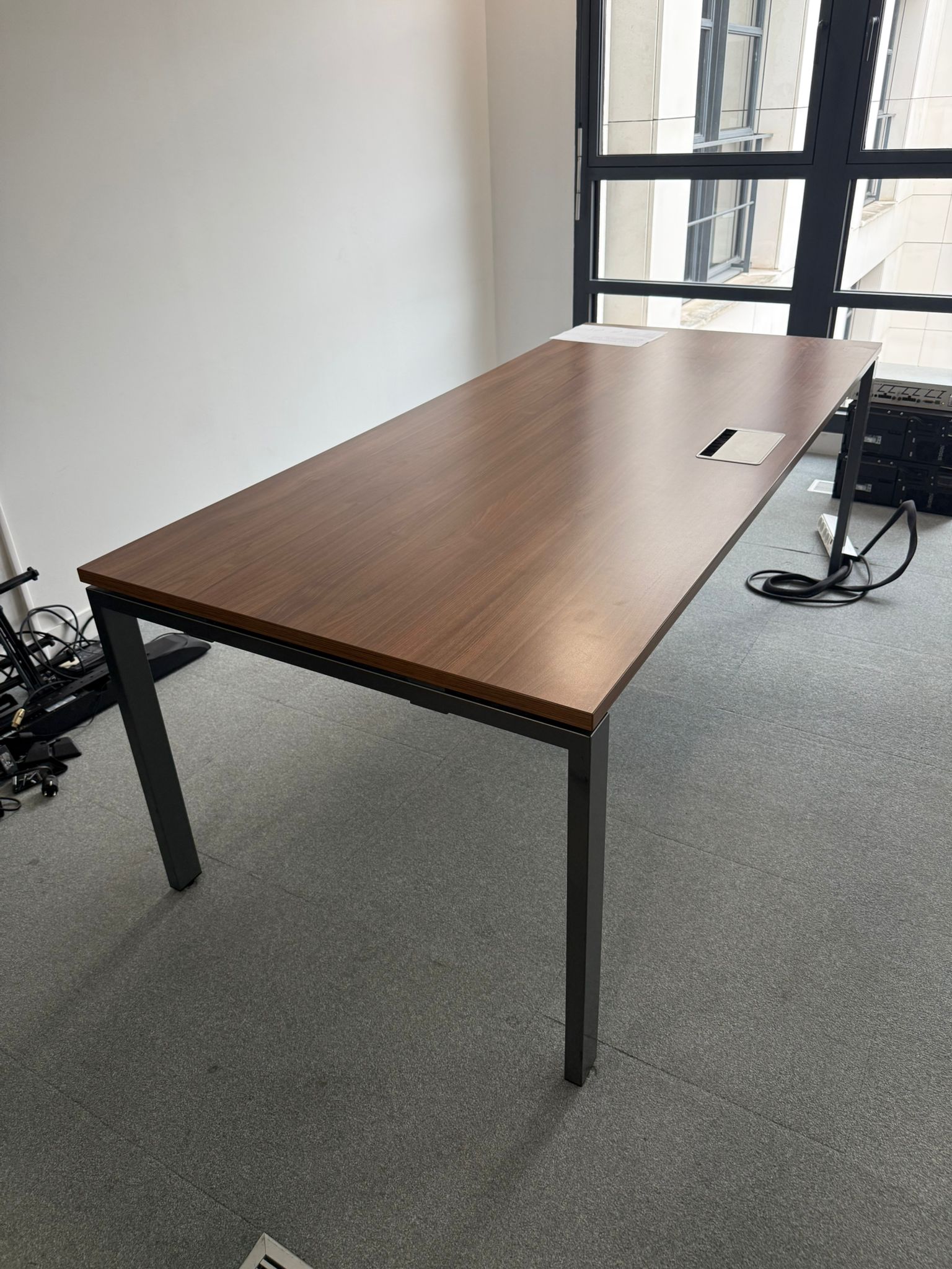 Table de réunion 200×80×74 cm avec plateau bois finition noyer et pieds métal gris anthracite. Grande surface, stable et idéale pour salle de conférence ou coworking.