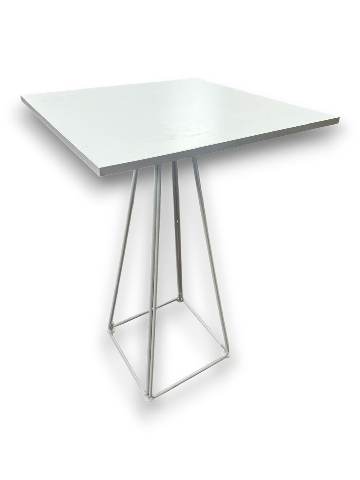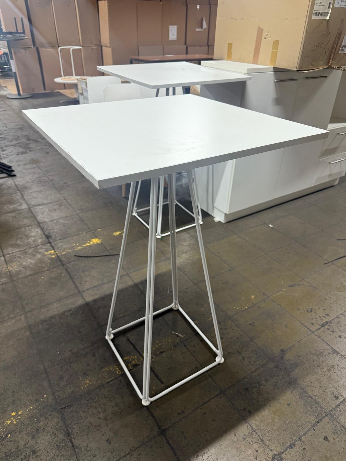 Table haute LUNAR blanche 70×70×107 cm, design minimaliste avec piètement métal. Idéale pour coin café, accueil, coworking ou espace pause.