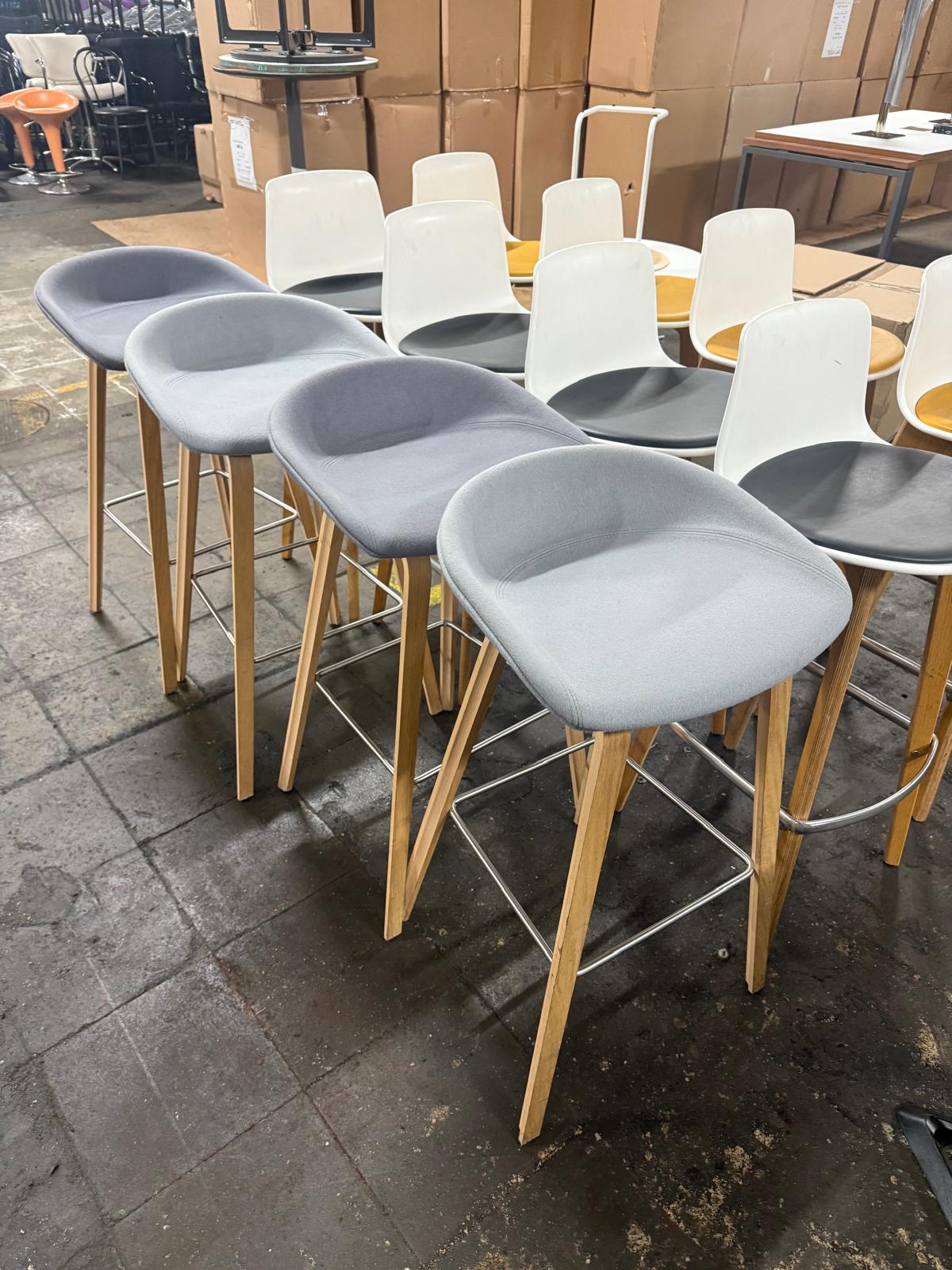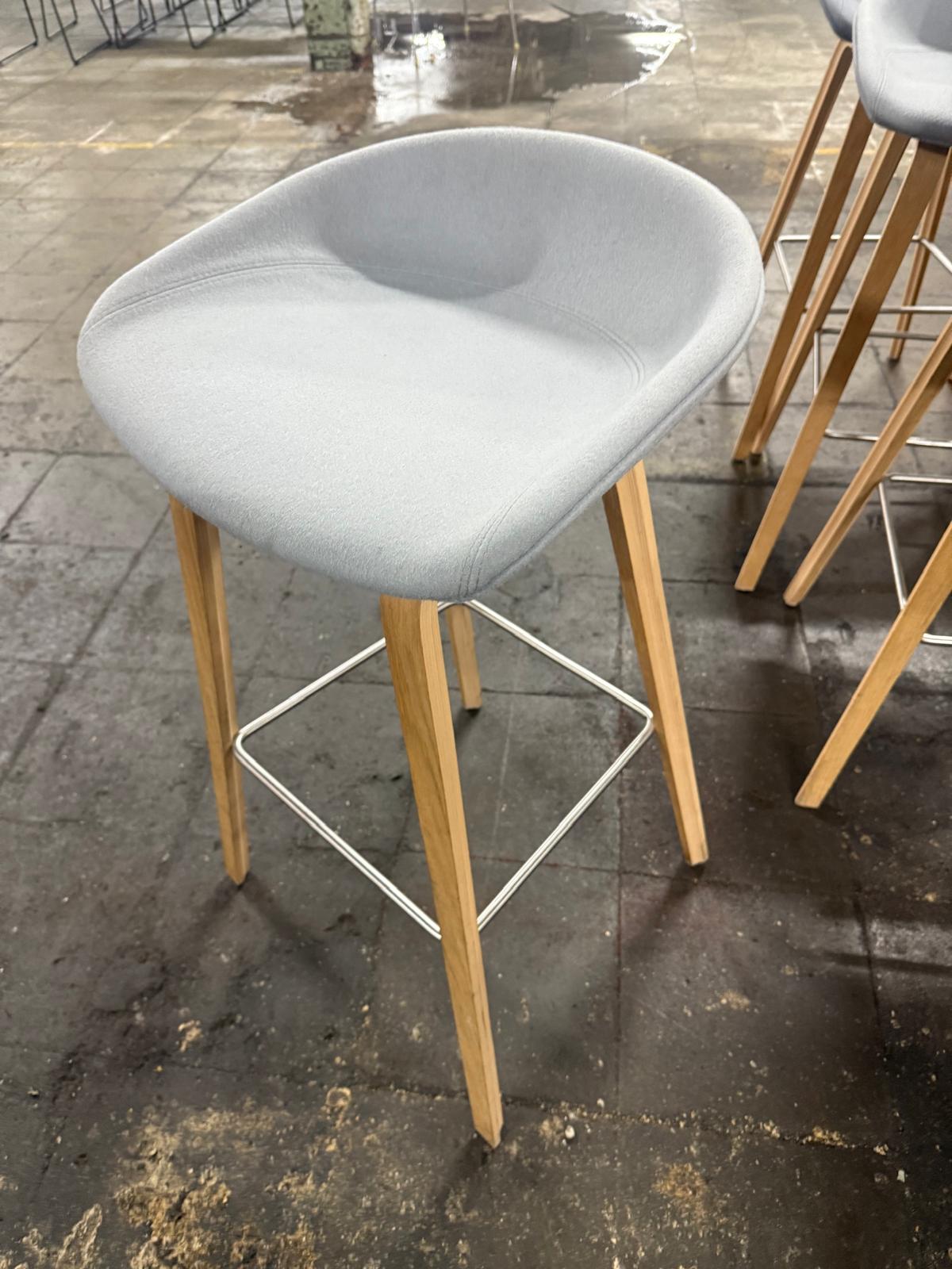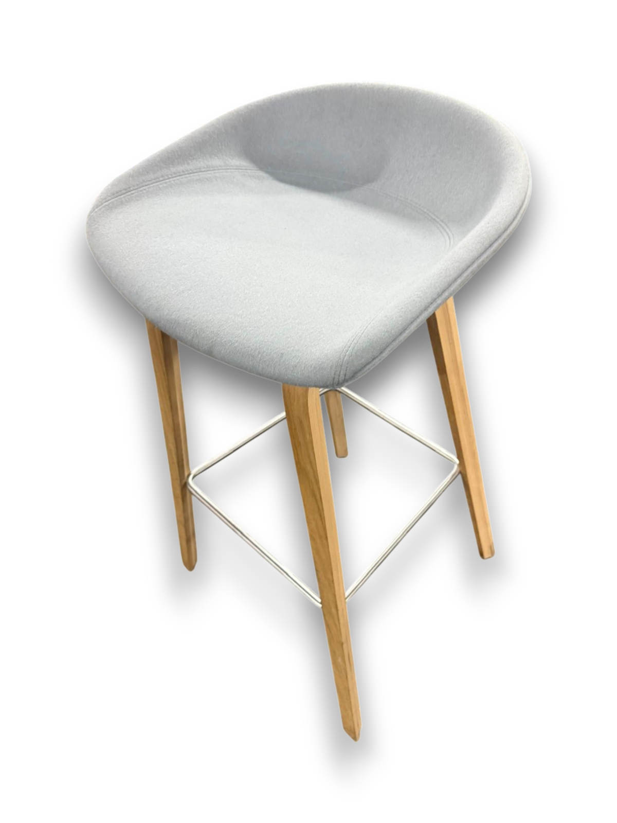 Tabouret haut AAS33 : assise rembourrée gris clair, pieds en bois et repose-pieds en acier. Confortable, stable et parfait pour îlot, bar ou espace pro.